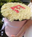 Композиція в коробці з 101 трояндою з викладкою літери "Е"
